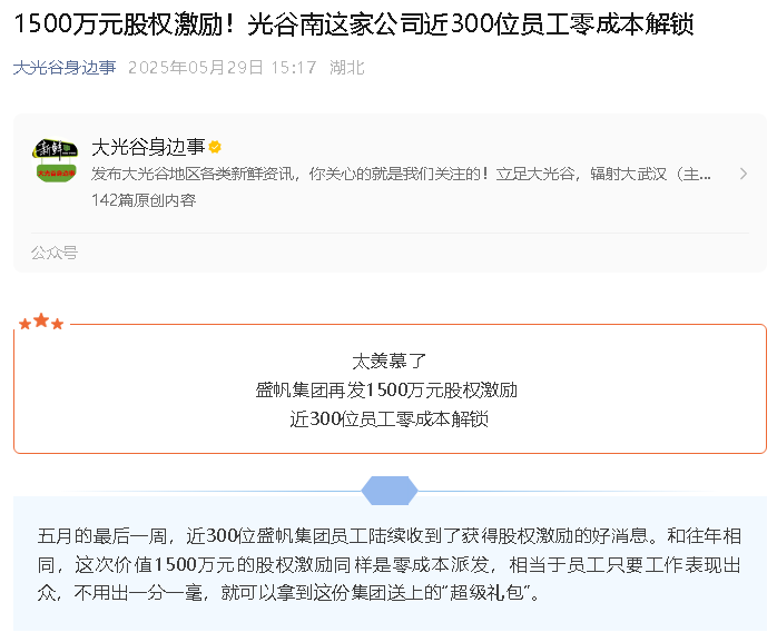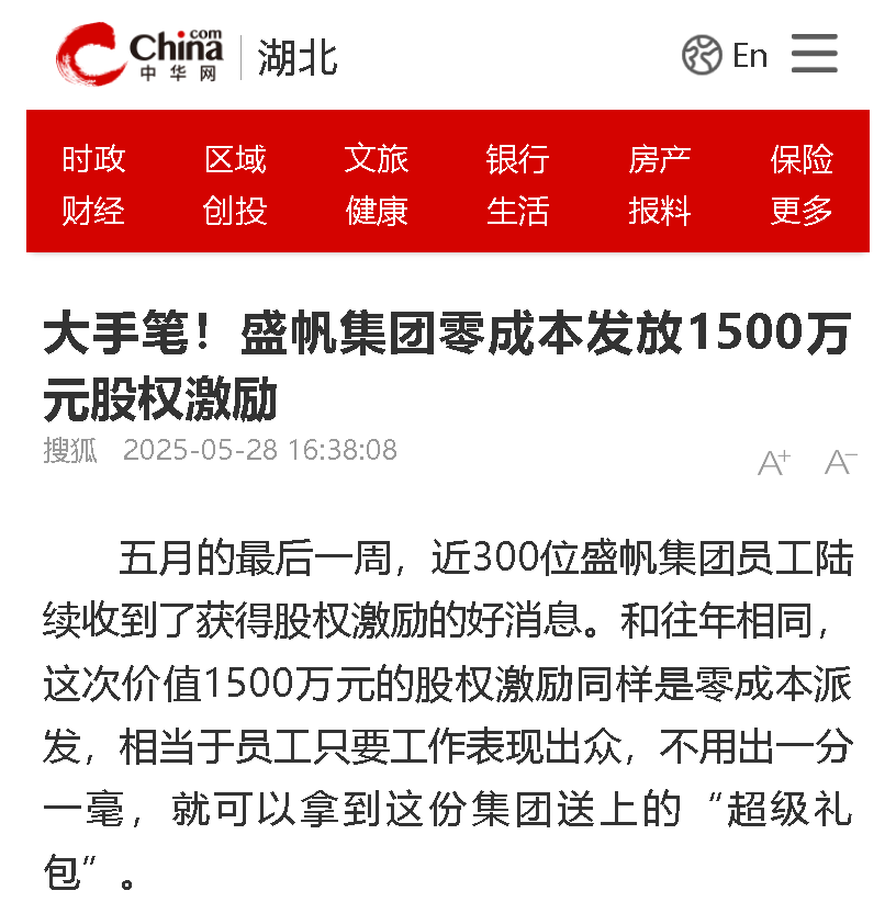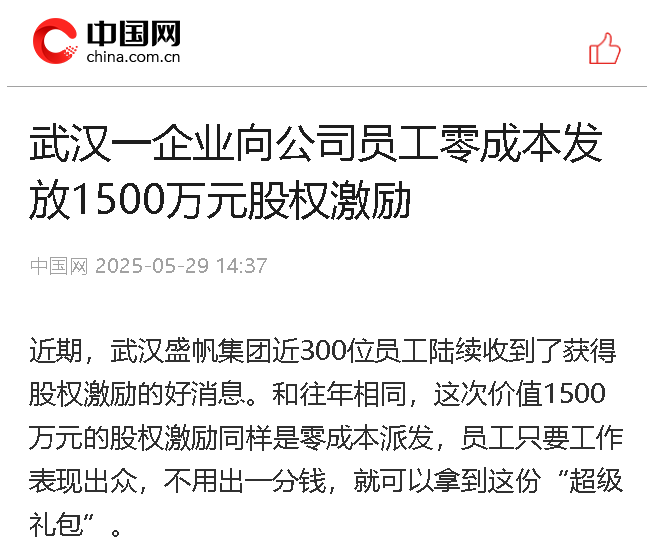 近期,武漢盛帆集團近300位員工陸續(xù)收到了獲得股權激勵的好消息。和往年相同,這次價值1500萬元的股權激勵同樣是零成本派···