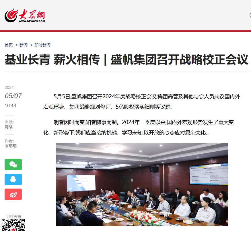 5月5日,盛帆集團召開2024年度戰(zhàn)略校正會議,集團高管及其他與會人員共議國內(nèi)外宏觀形勢、集團戰(zhàn)略規(guī)劃修訂、5億股權(quán)落實細···